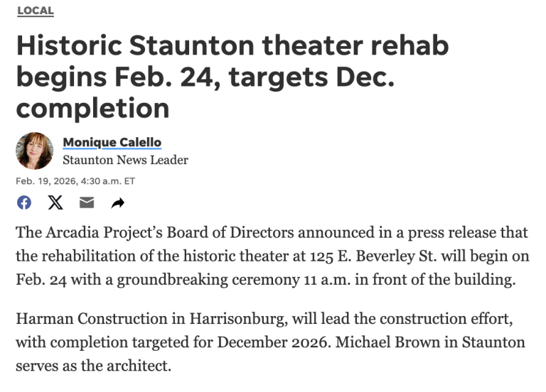 Staunton’s Arcadia Project awarded $1.5 million revitalization grant – Aug. 2, 2023